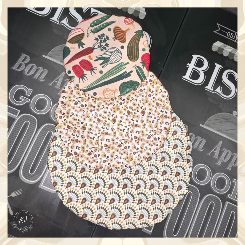 Confectionnée à la main avec des tissus enduits certifiés Oeko-Tex, et doublée d’un tissu imperméable type PUL, elle est lavable, réutilisable et écologique. L’élastique souple permet un maintien parfait autour du récipient, sans effort.